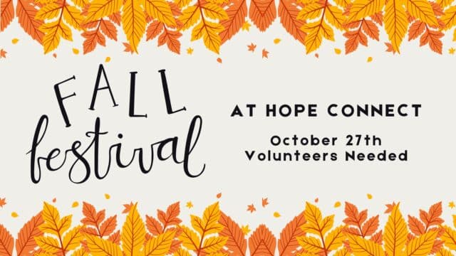 Celebrate fall by volunteering at Hope Connect’s fall festival on Sunday, Oct. 27th. Sign up to help set up, run the booths, or clean up. This event is located at 2313 W Market St.