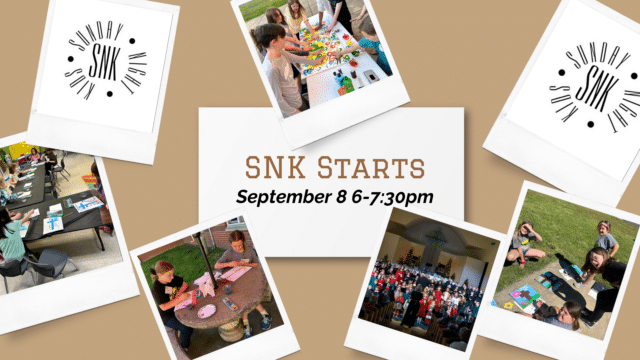 We are excited to start SNK Sept 8. PreK-5th grade are welcome to come any and all weeks for weekly mission projects, games, and Christmas concert preparation. At the same time the youth meet, adult small groups, adult choir and nursery!