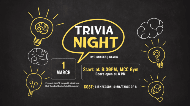 Come flex your trivia knowledge – or lack thereof, we don’t judge! – at a fun night to support our Youth Ministry on their Camden Mission Trip this summer. Invite your friends, book a whole table, or come solo and make some new friends! Bring your own snacks, and don’t forget the cash for door prizes, games, and trivia perks! Reserve your spot today… registration closes on February 24. After you get signed up, keep an eye on your email for all Trivia Night details to come your way once registration closes.